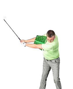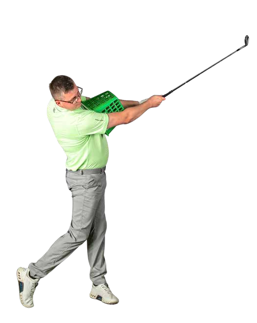 This exercise is about retraining your body motion, so we don’t need to get distracted worrying about the result of a shot. So set the balls to one side for a moment, take a range basket and place it against your chest, securing it between your upper arms. Make a short backswing, keeping the basket in place. You’ll quickly feel how your body must turn rather than just moving your arms independently.