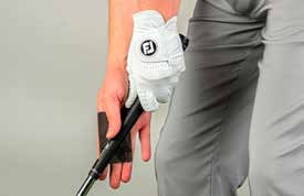 For this exercise we are going to use a credit card-sized piece of plastic. Hold it against the side of the club’s handle as shown, fingers outstretched and pointing downwards. As you can see, the card and palm are both facing your target, while your gloved-hand hold remains as normal.