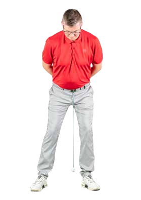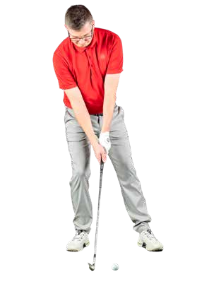 Here, I’ve tied a weight – in this case a golf ball – to my belt buckle. If I were to stand normally – weight 50-50 – the ball would hang midway between my feet. But by leaning slightly into my left or lead side, I can get the ball to hang just inside my lead heel. This position – around 60% of my weight under my lead foot – is ideal for promoting the downward strike we need for short irons.