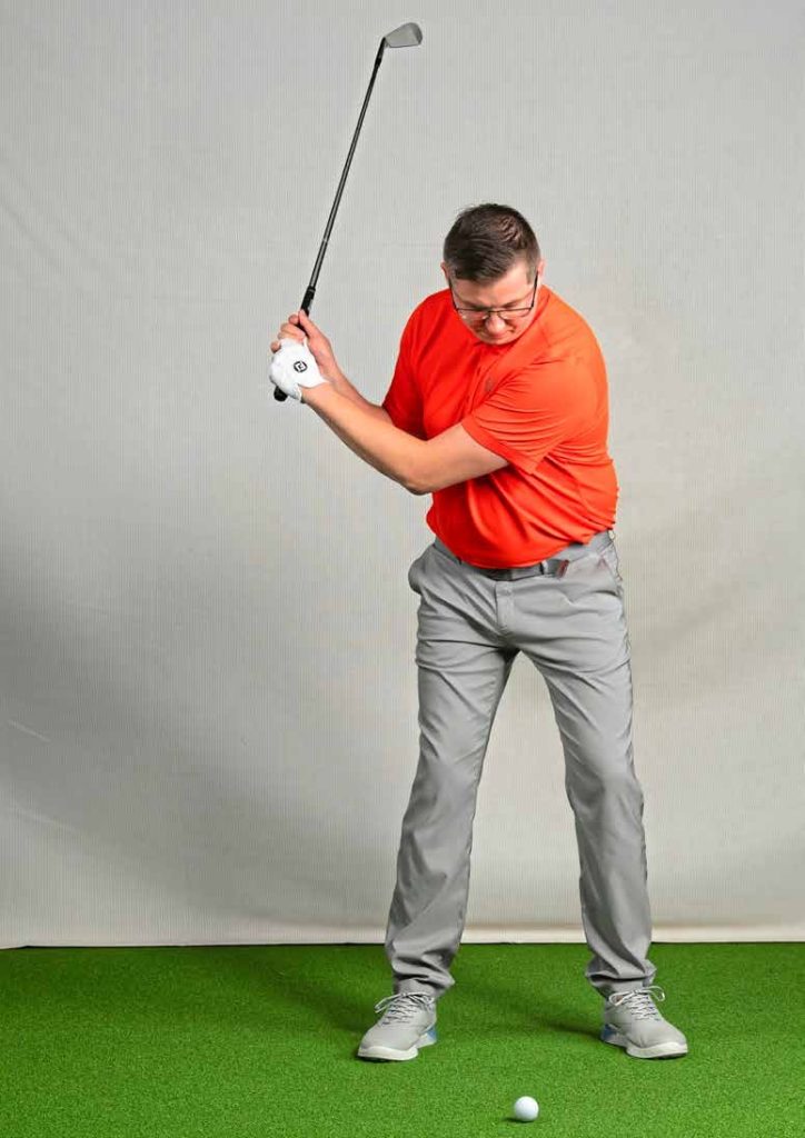 Picture the club’s journey during the backswing. Of course it will move upwards but it will also move around us, from in front of our chest to behind our head. It’s the armswing/body turn blend that allows the club to follow this ideal, up-and-around path, the core providing the rotation and the arms delivering the lift. But if the arms dominate the motion, we find the following issues:
