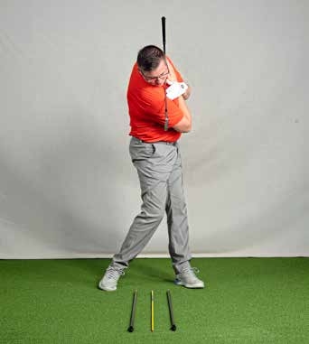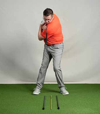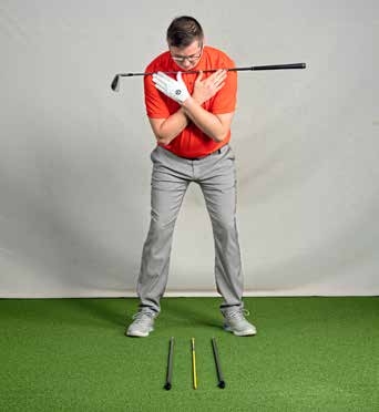From that ‘address’ position, we are going to wake up the body by using it alone to make a backswing. So keeping the club against both shoulders, turn your chest away from the target. Keep turning until the butt of the club points down at the rearward stick. If you’ve not been using your torso much in the swing, this rotation will be hard work… but persevere.