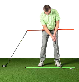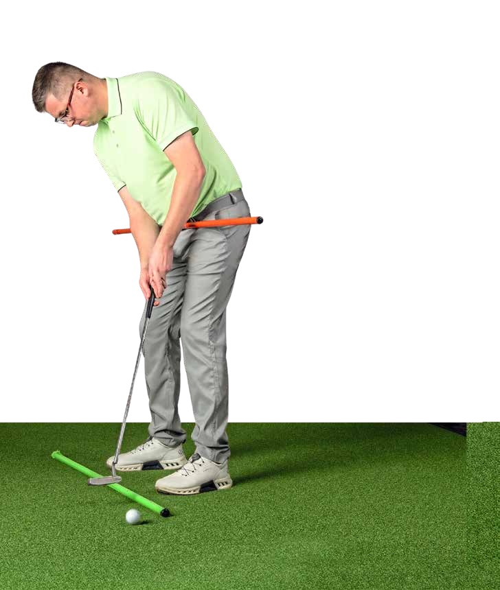 Place an alignment stick or clubshaft on the ground, parallel to your target line. Insert another alignment stick through your belt loops, ensuring it runs parallel to the one on the ground. Make a putt and hold your finish. Check that the stick in your belt loops remains square to the shaft on the ground and the target. If it rotates off-line, it means your hips are moving excessively, affecting your stroke.